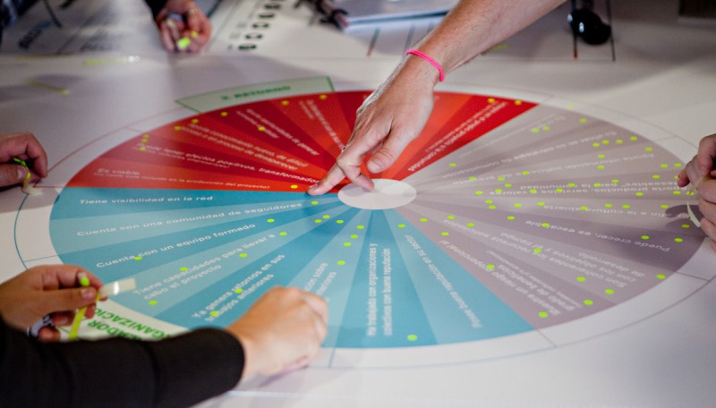 Esta parte práctica escenifica en modo "analógico" cómo funciona un proceso de crowdfunding a través de dinámicas participativas. Gracias a ellas es posible descubrir y reflexionar en torno a aspectos clave como son los criterios de evaluación, o cómo abrir y hacer atractivos los proyectos, tanto para impulsores de iniciativas como gente interesada en este nuevo paradigma e instituciones afines. El taller permite acercarse a herramientas y barómetros de valoración de propuestas a partir de indicadores como el grado de innovación, nivel de proximidad, coherencia, etc., con los que interactúan los participantes.