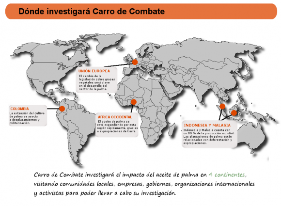 No pocos periodistas nos sentimos expulsados del sistema, en el sentido de que no tenemos lugar -¿lo tuvimos alguna vez?- para hacer el periodismo que queremos. En el caso de Carro de Combate, desde 2012 nos dedicamos a investigar los orígenes de los productos que compramos, y eso nos lleva a preguntarnos por las condiciones en las que se extraen las materias primas, y después se manufactura, en Asia, África o América Latina. La última aventura en la que nos embarcamos es investigar el aceite de palma: primero, porque lo consumimos, sin saberlo, todos los días; segundo, porque es tal vez el monocultivo que más impactos está provocando en todo el mundo: deforestación, pérdida de biodiversidad y desplazamientos forzosos de campesinos del Sur global, daños en la salud de los consumidores. Queremos aportar un trabajo de investigación que combine los datos estadísticos con los testimonios tomados de primera mano. Esta vez, no se trataba de hacer un pequeño monográfico, como hemos hecho tantas veces prácticamente sin recursos. Esta vez queríamos profundizar. Y para eso necesitábamos fondos.