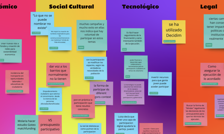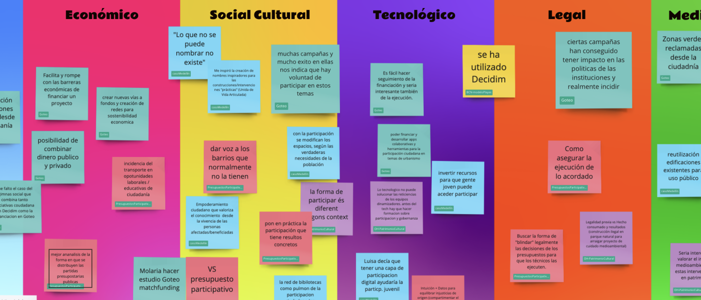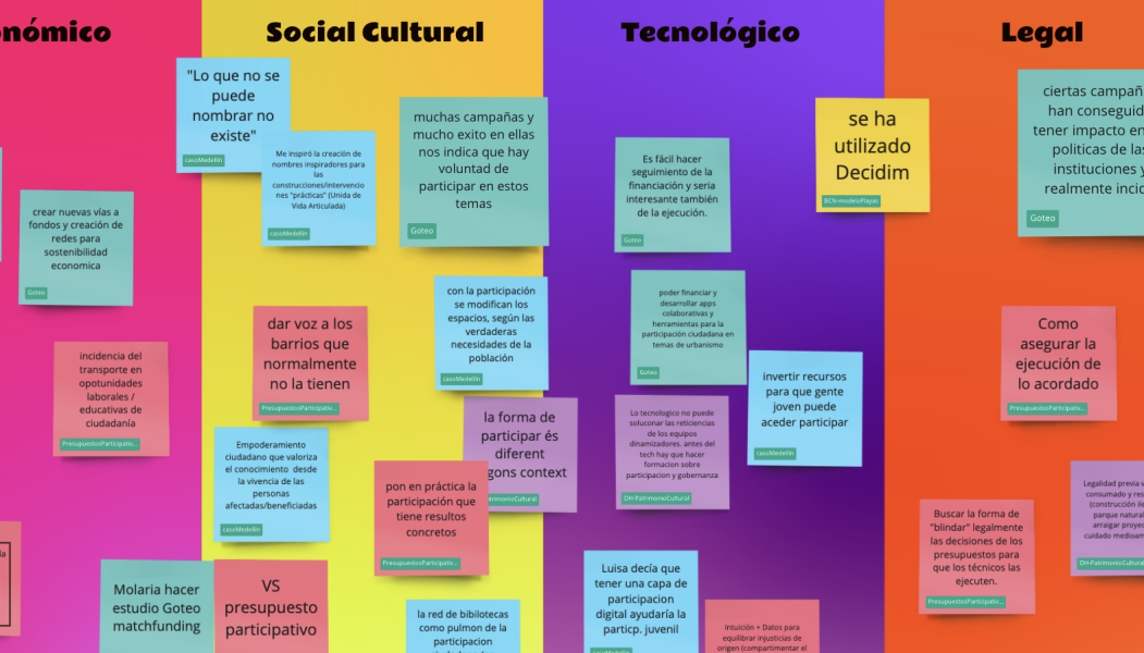 Una vez terminadas las intervenciones se formaron dos grupos diferentes, uno de trabajo online y otro presencial en Canòdrom (sede de Platoniq en Barcelona) donde se inició una dinámica participativa en la que, guiados por dos facilitadoras, rellenamos un tablero interactivo de Miro con un análisis Pestel colectivo tratando de responder a la pregunta: "¿Cómo contribuyen todas estas grandes experiencias al urbanismo participativo desde el punto de vista político, económico, social, legal, tecnológico y ambiental?"