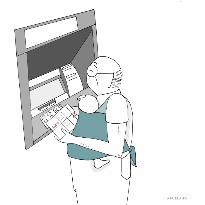 Como todas las mañanas, el abuelo porteador ha salido a dar un paseo con su nieto. Todavía hace bueno y hay que aprovechar, se dice. Entre otros recados, coordinados por su mujer, ha ido al banco para actualizar su cartilla. Y cual ha sido su sorpresa, si la graduación no le falla, que las cuentas van saliendo. ¡Casi, casi, han llegado al mínimo para poder publicar el libro en el vecindario de Abueland!