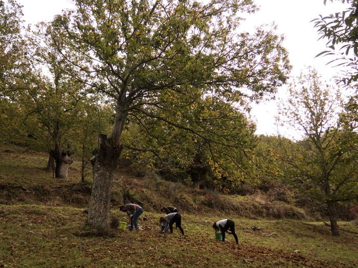 Se vos preguntades cal é o noso sistema para recoller as castañas contámovolos sen problema. Non hai truco: agachándose. Si, a recollida é toda manual xa que a orografía complica a mecanización e, ademáis, deste xeito facemos no propio souto unha primeira selección, desbotando as castañas que teñan verme ou estén en mal estado. Así, durante os próximos días as nosas xornadas transcurrirán de souto en souto na busca de castañas. Cada un vai apañando nun caldeiro, despois xúntanse e sacos e, por último, trasládanse ata a nosa nave, onde se seleccionan para vender en fresco ou secar. Son días intensos, de moito cansanzo, pero o certo é que como os últimos anos foron tan ruíns estamos desexosas de que a colleita sexa boa aínda que iso supoña acabar coas costas un pouco doloridas. Crucemos dedos… e castañas haxa!