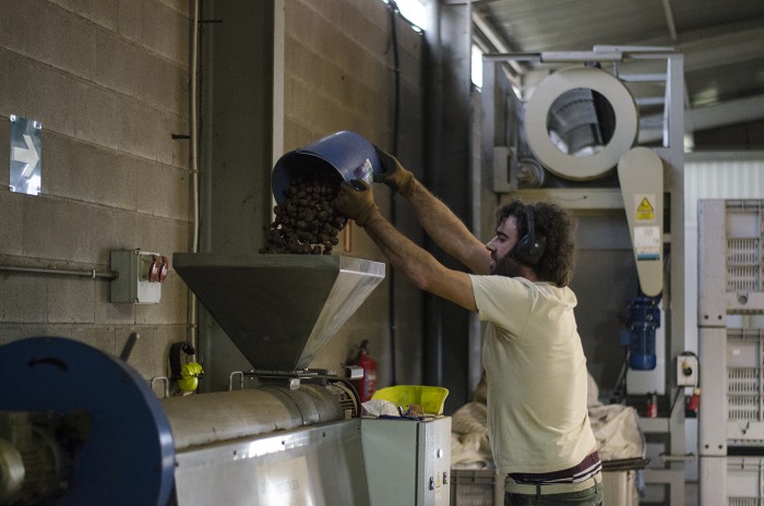 O noso sequeiro funciona cunha caldeira de leña, pero as castañas non as secamos con fume, senón con aire forzado, que acada unha temperatura de arredor de 35 graos. Decidimos empregar este tipo de caldeira para poder alimentala coa leña que obtemos da demouca. Deste xeito, aproveitamos a tope todos os recursos que nos ofrece o souto. Unha vez que a castaña está no seu punto óptimo de secado, pasa á peladora.