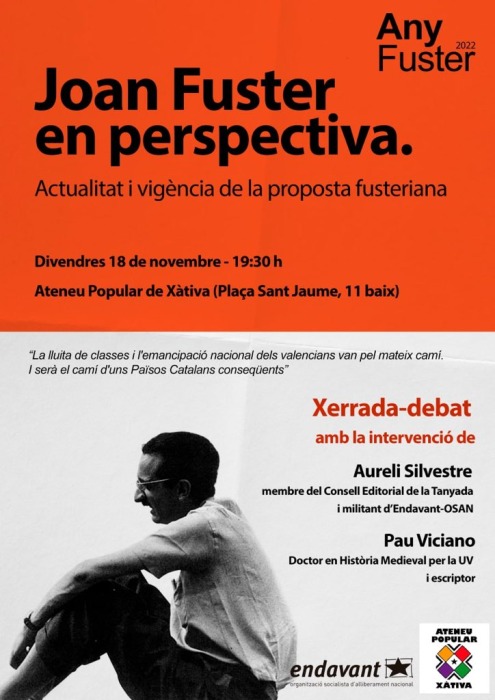 L'assemblea d'Endavant de la Costera i la gent de l'Ateneu Popular de Xàtiva organitzen una xerrada aquest divendres sobre l'actualitat i la vigència de la proposta fusteriana. Comptaran amb dos persones que han tingut una participació important a l'hora de fer possible Ara, Joan Fuster: una proposta per als Països Catalans.