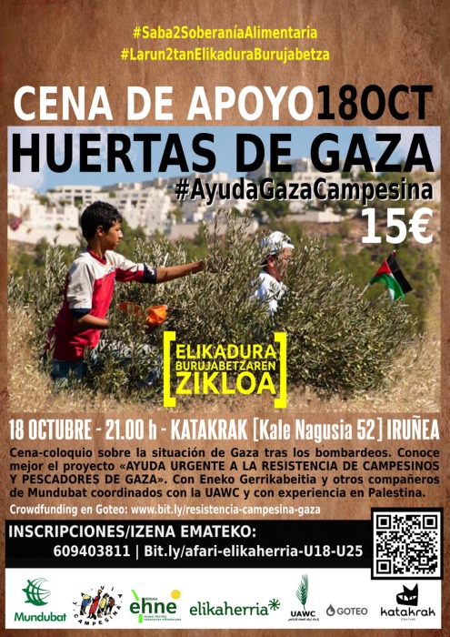 Buena parte del equipo de Mundubat, Elikaherria y #AyudaGazaCampesina va a tomar parte en la primera actividad Ciclo de Soberanía Alimentaria en Katakrak. Será un placer y un honor coincidir en Iruñea con parte de las personas y colectivos que ya venís empujando con nosotros de este proyecto de financiación colectiva.