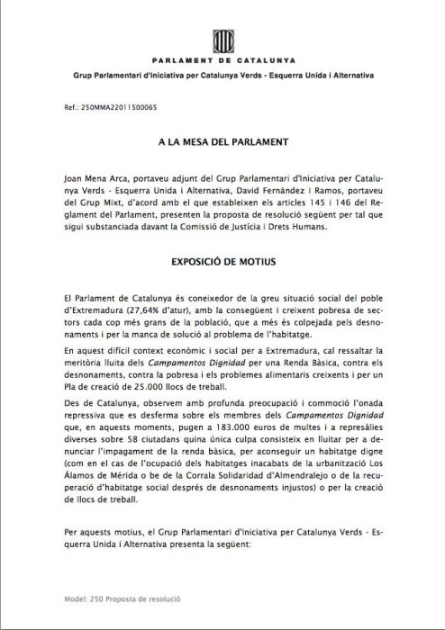 Joan Mena Arca, portavoz adjunto del Grupo Parlamentario de Iniciativa por Cataluña Verdes - Izquierda Unida y Alternativa,  David Fernández y Ramos, portavoz del Grupo Mixto, de acuerdo con lo que establecen los artículos 145 y 146 del Reglamento del Parlamento presentan la propuesta de resolución siguiente para que sea sustanciada ante la Comisión de Justicia y Derechos Humanos.