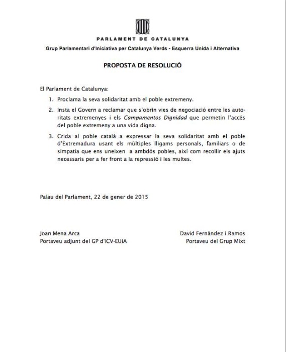 El Parlament de Catalunya admite a trámite una propuesta de resolución en apoyo a los Campamentos Dignidad de Extremadura.