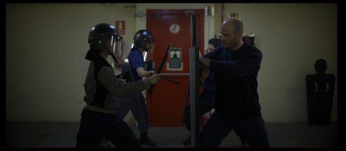 Para preparar esta sesión, vino un entrenador de verdad de la policía, que enseñó a los actores cómo manejar la porra, entre otras cosas. Como no somos muy expertos, ejem, hubo algún percance… ¡alguno se llevó un porrazo! Suerte que fue sólo un chichón. Ya se sabe, gajes del oficio…
