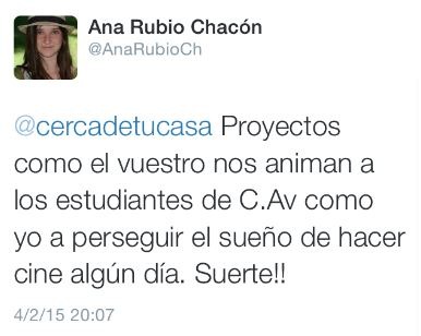 No lo negaremos: el mensaje de @AnaRubioCh es uno de los que más ilusión nos ha hecho. Ana, ¡casi se nos cae la lagrimita! Contagiar nuestra pasión por el séptimo arte a estudiantes de comunicación y cine es una de las razones por las que hemos creado este blog.