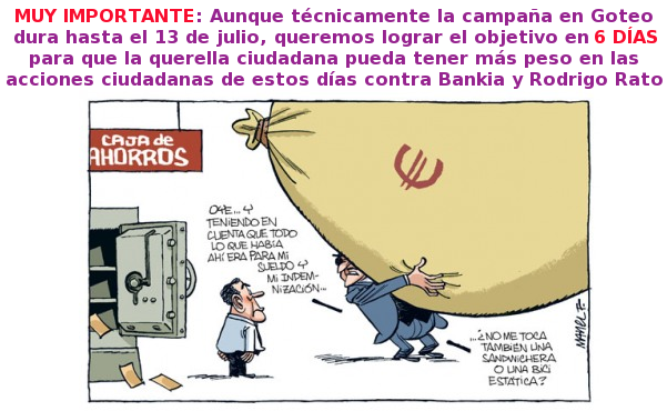 En consecuencia, la ciudadanía organizada en torno a @15MpaRato (http://15mparato.wordpress.com/) ha decidido presentar la primera querella del pueblo contra la banca.