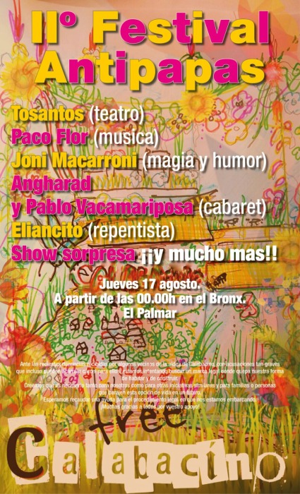 En segundo lugar, queremos mostrar nuestro profundo agradecimiento, de todo corazón, a nuestra amiga Beli Cáceres y toda la tropa del Bronx, un encantador rincón del Palmar, Cádiz, con una magnífica programación teatral, musical y cabaretera. El pasado "Juviernes" 17 de agosto, el IIº Festival Antipapas organizado por ellos donó su recaudación íntegra al Calabacino para nuestros gastos de defensa. Además de ser una artista como la copa de un pino, Beli tiene un corazón que casi no le cabe en el pecho de grande, y no dudó en ofrecernos este regalazo para ayudarnos en cuanto supo en qué pleitos andábamos. Así que no podemos por menos que agradecer una y mil veces tan altruista demostración de energía y apoyo a Beli, al resto de artistas del cartel, a la gente del Bronx, a los técnicos de luces y sonido, y al público asistente. Nuestros enviados especiales al evento cuentan que fue todo un éxito de crítica y público, y que entre los asistentes se respiraba un ambiente tan palpable de solidaridad activa y creativa que casi podía tocarse con los dedos...