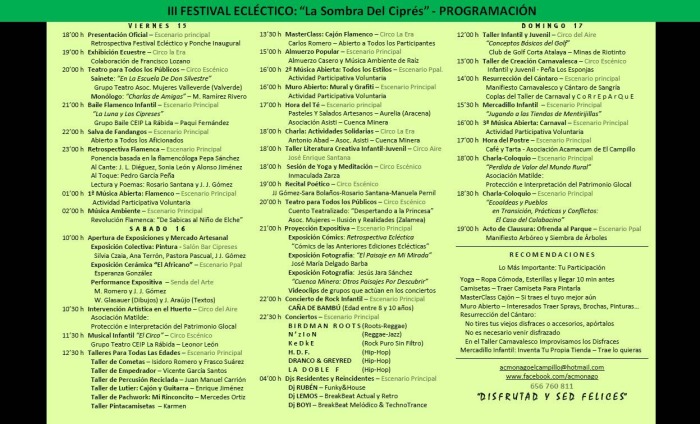 El festival hace honor a su nombre: Música, teatro, ecología, actividades infantiles, talleres de lo más variado… Un programa gratuito dirigido a gente de todo tipo de edad, procedencia e inquietudes. Van por su tercera edición y habla muy bien de la conciencia social, y ganas de celebrarla, de sus vecinas y vecinos. Os adjuntamos el cartel para dar cuenta de todo ello, agradecemos mucho su invitación a participar del mismo y os invitamos a acudir a quienes andéis cerca.