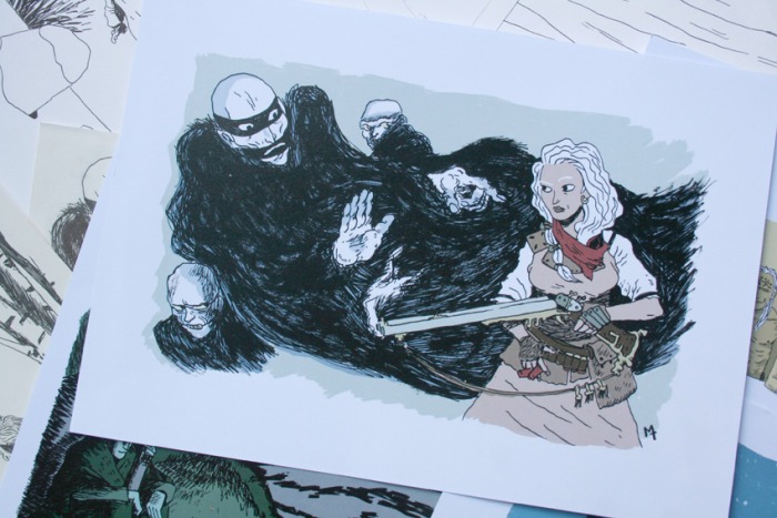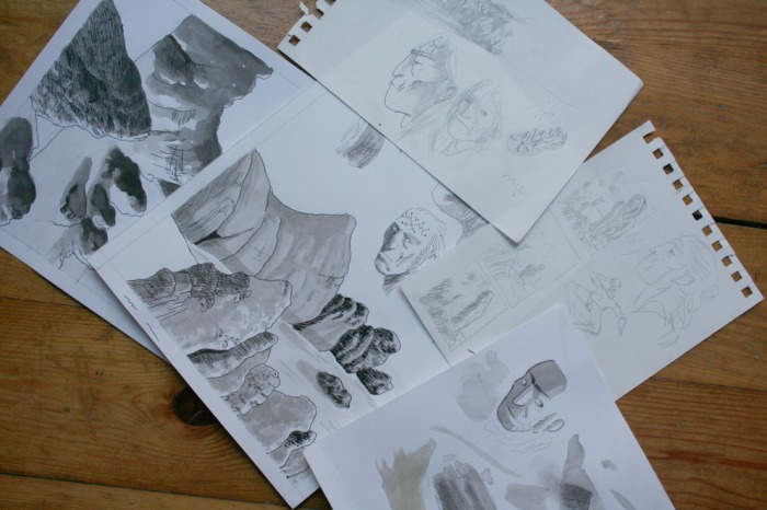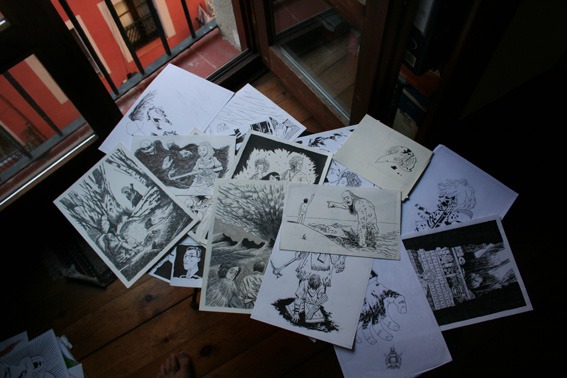 Ahora toca trabajar con reglas claras: las nuevas ilustraciones serán en blanco y negro; la técnica: diferentes tipos de lápiz y aguadas de tinta china. Buscamos algo más atmosférico, que abra más los paisajes del mundo de Whomba. Más cielos, más bosques, más ciudades para acompañar los rostros de nuestros protagonistas. ¡Y 12 hermosos originales para vuestras paredes!