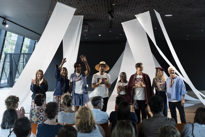 Tras la exhibición de las prendas, hubo una mesa redonda en la que Oihane Pardo, Amaia Olmedo, de Boinas Elosegui; Leire Jaime, de TheLocalSS; Clara Virgili, patronista; y Gorka González, sombrerero, comentaron los procesos de trabajo que habían seguido para crear esta colección. Para su confección, Oihane Pardo explicaba cómo ha colaborado con artesanos, diseñadores y empresas referentes del sector de la moda de Euskadi y España, replicando la importancia que tenía el equipo en el viaje de Elkano.