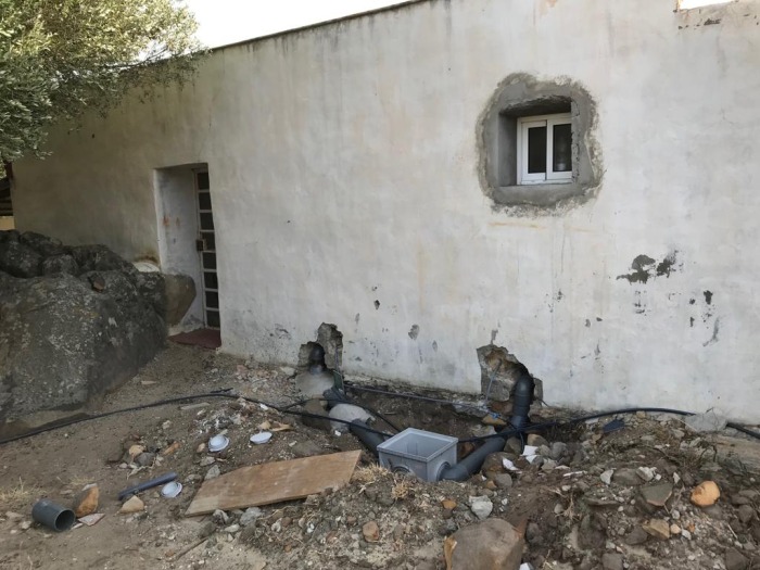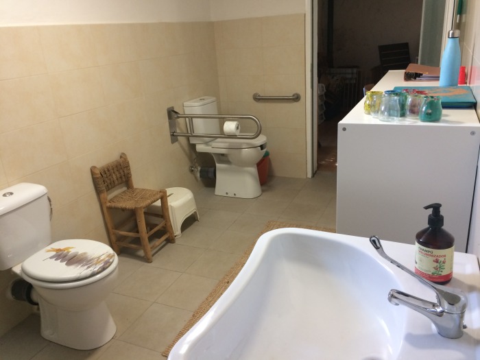 Hemos conseguido hacer la obra para tener un WC con accesibilidad a sillas de ruedas donde solamente había un trastero. Lo cual ha implicado la instalación de una nueva fosa séptica, toda la cañería, un lavabo y dos inodoros, más el alicatado completo de suelo y paredes.