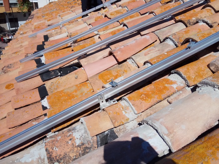 Hem avançat i ja tenim els riels al nostre teulat. La instal·lació cobra sentit i estem aprenem molt del procés, de cada decisió. Utilitzar materials respectuosos, comprar materials en comerços propers, productes de qualitat, reciclar i reutilitzar tot el possible... i per suposat prendre decisions en equip, valorar totes les aportacions i acoplar horaris per a poder poc a poc avançar en tindre una instal·lació de plaques en el local.
