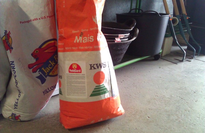 Esta mañana hemos ido a un almacén agrícola y mirad con lo que nos hemos encontrado, así para vender a granel a cualquier abuelico o abuelica que quiere plantarse un poco de maíz pa comer o dar de comer a sus animales; Maíz transgénico de Monsanto!!!!!!!