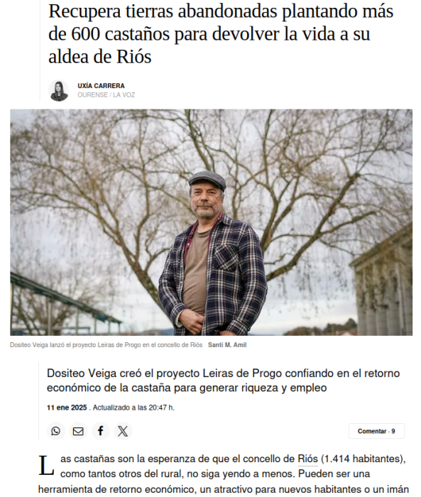 Hai unhas semanas chamárannos da Voz de Galicia. Querían facer seguimento do proxecto e alí que nos tiveron media horiña ao teléfono. O resultado, que este sábado 11 de xaneiro saímos na portadiña da edición de Ourense. O artigo quedou bastante ben e resumido, e dá unha idea xeral do que queremos facer. Como é para suscritores https://www.lavozdegalicia.es/noticia/somosagro/forestal/2025/01/06/recupera-tierras-abandonadasplantando-650-castineiros-devolver-vida-aldea-rios/00031736164108621673857.htm achégovos as capturas de pantalla co texto.