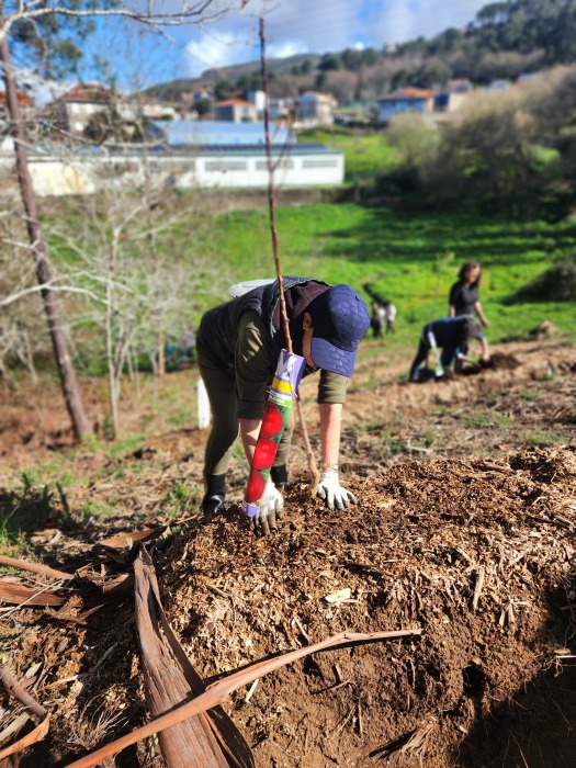 Durante este mes de febreiro estivemos preparando parte do noso terreo para as primeiras plantación, e, tras moito esforzo, o pasado sábado 22 comezamos coas primeiras plantacións. Lanzamos unha convocatoria aberta a toda a veciñanza e persoas colaboradoras e xuntámonos para plantar: pexegueiros, ameixeiras, maceiras e pereiras xunto con varios arbustos de froitos silvestres como arandos ou framboesas. Un total de 25 persoas estivemos plantando os primeiros 20 árbores e outros tantos arbustos.