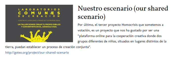 Desde éste martes, tres proyectos de Goteo, entre los que se encuentra "Our shared scenario", han sido seleccionados para participar en una iniciativa de Toshiba, a través de la pataforma social Homocrisis, por la cual repartirán 1000 euros entre dichos proyectos. La modalidad será a través de una votación web, en la que cada proyecto recibirá el dinero acorde al porcentaje de votos obtenidos.