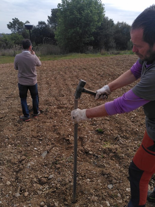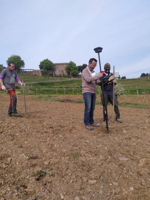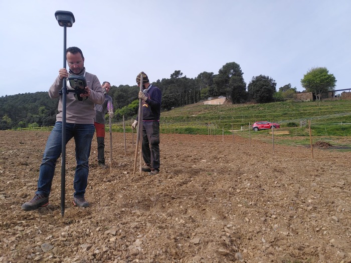 Amb aquestes feines, definim com serà aquesta vinya i on hauran d’anar els pals que sostindran el sistema d’emparrat dels ceps. És una feina prèvia a la plantació i és molt important, ja que es defineix el marc de plantació (quantes plantes aniran a la finca i la separació entre elles) i, per tant, quina productivitat tindrà aquesta finca, tenint en compte també criteris d’orientació i insolació.