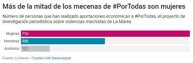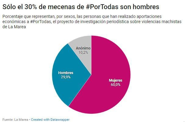 Como no podía ser de otra manera, La Marea vuelve de manera recurrente a los datos. Ana Ordaz y Carmen Lozano evaluaron qué comportamiento está teniendo la campaña #PorTodas después de alertar el 24 de octubre que la mayoría de las donaciones procedían de mujeres. La tendencia se mantiene. Cuando la recaudación sumaba el 55% ayer 13 de noviembre, el 60% de las cofinanciadoras eran mujeres, el 30% eran hombres y el 10% restante eran aportaciones anónimas.