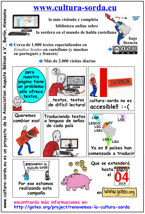Hemos producido un volante sobre la campaña, que tradujimos también al alemán y al inglés. Los colgamos aquí, para continuar la difusiòn de nuestro proyecto. Saludos cordiales de www.cultura-sorda.eu!