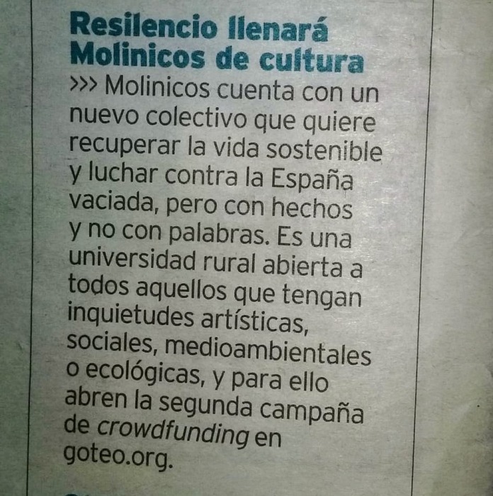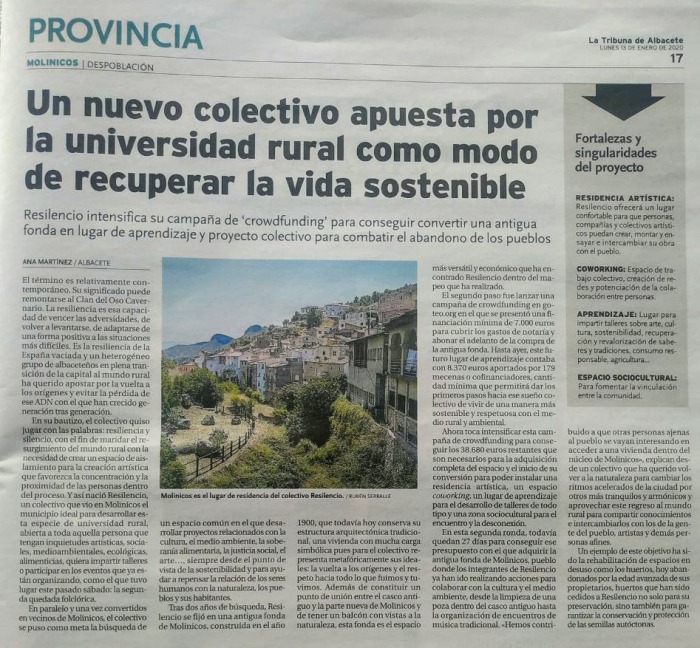 Así describe Ana Martínez, en La Tribuna de Albacete, como en Resilencio queremos convertir la antigua fonda de Molinicos en lugar de aprendizaje y proyecto colectivo para combatir el abandono de los pueblos.