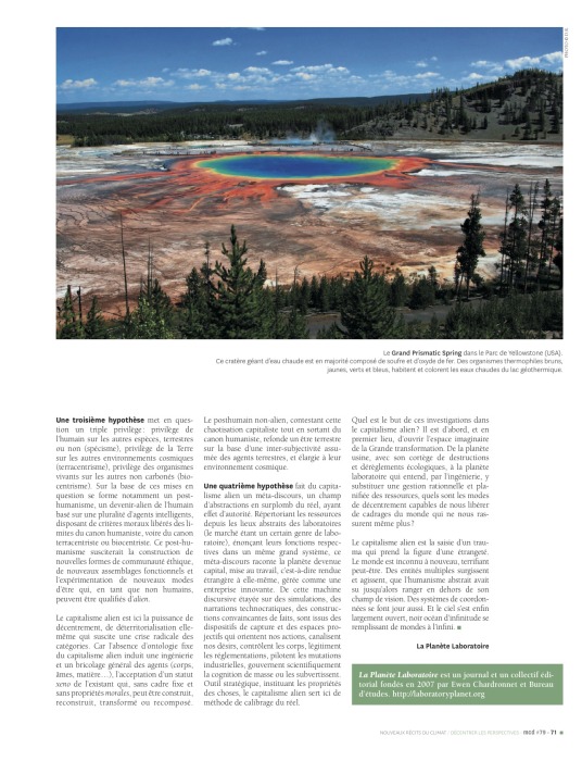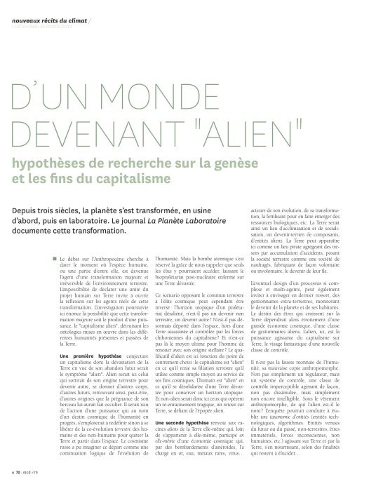 Depuis trois siècles, la planète s'est transformée, en usine d'abord, puis en laboratoire. Le journal la Planète laboratoire documente cette transformation. Avec un cinquième numéro cette année, une investigation collective ouvre des perspectives aventureuses sur les agents de cette transformation et les positions possibles que nous y occupons.