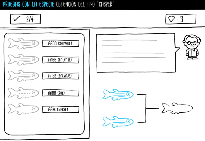 PRUEBAS CON LA ESPECIE: Aparte de aprender vocabulario en inglés, también se aprende a diferenciar el sexo del pez cebra, el apareamiento del mismo y cómo obtener genéticamente un ejemplar tipo "Casper"
