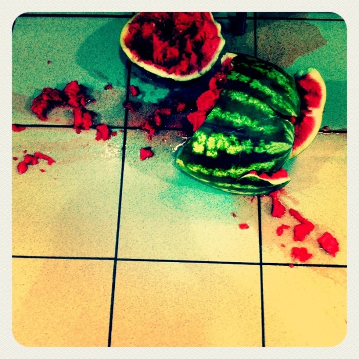 Comienza la aventura en un avión a Ben Gurion International Airport donde Carmen me estará esperando para ir a casa de sus padres, descansar y comenzar al dia siguiente con el Show#1 en Mevaseret Absortion Center. Pero…donde está la maleta con todas las cosas del show? Llegamos a casa con la maleta de mano y las ilusiones destrozadas (como la sandia de la foto). Al día siguiente después de cancelar nuestro primer espectáculo salimos en busca de nuevo attrezzo, dispuestas a hacer producción express en el centro de Jerusalen y seguir nuestro camino. Luego de comprar un teléfono para nuestro viaje, a las 4 de la tarde recibimos la llamada: hemos encontrado su equipaje! Comimos Humus y fuimos felices. Así comenzó y termino nuestro día 1 en Jerusalén. Mevaserat Absortion Center tendrá su show la semana que viene y nosotras nos levantaremos mañana para sonar en Ramalla y Billin.